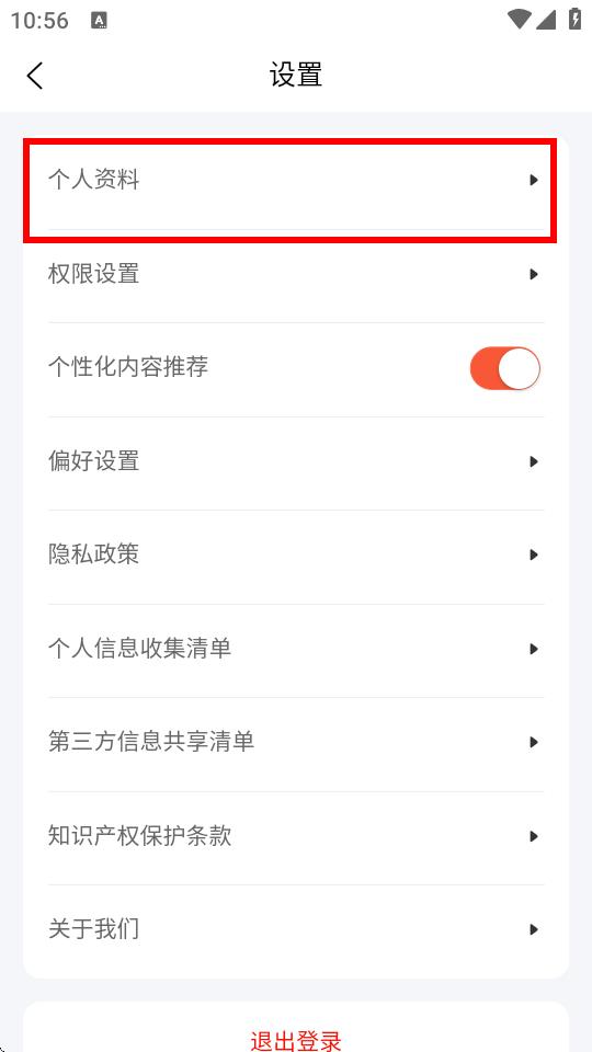 3、进入设置页面后,点击个人资料。