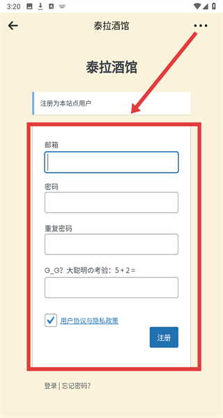 4、在注册页面依次填写对应输入框的注册信息后,勾选用户协议与隐私政策,点击“注册”按钮,完成账号注册流程。