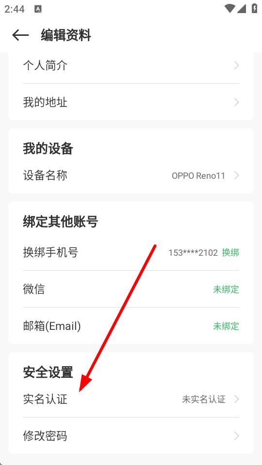 3、进入编辑资料页面后,下滑找到安全设置板块里的实名认证选项并点击。