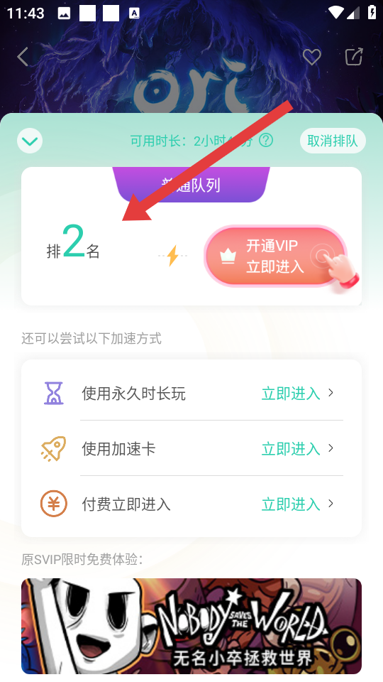 3、可以选择等待队列前进,排名到1后自动进入,或者点击使用永久时长玩等方式快速进入游戏。