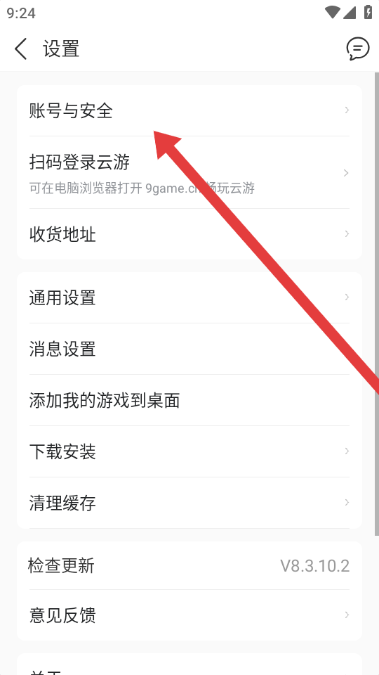 1、进入九游设置页面后,点击账号与安全的选项,进入账号安全设置的界面。
