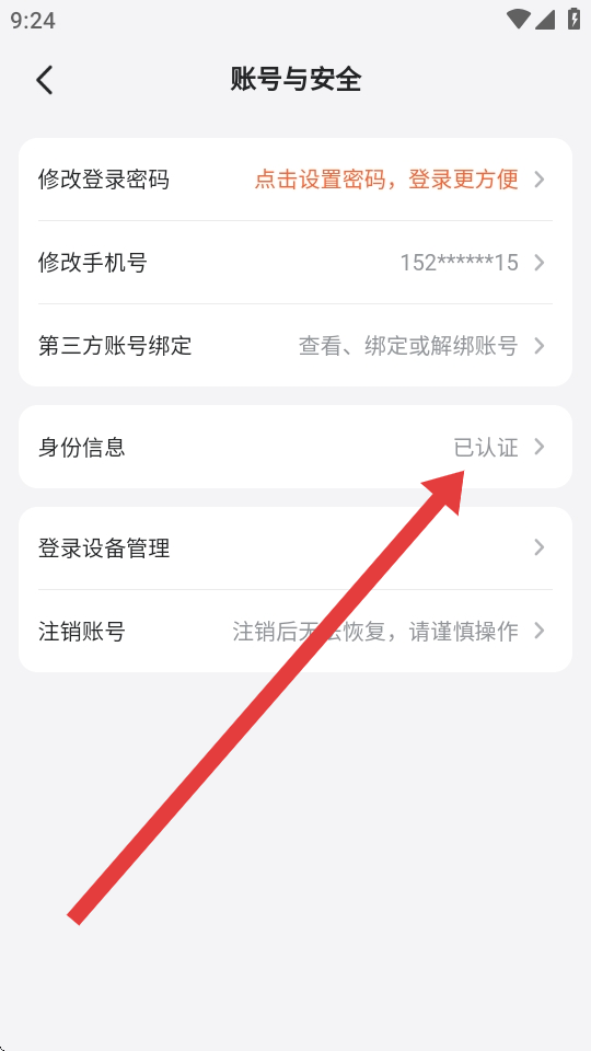 2、在账号与安全页面中,点击身份信息已认证的选项,进入身份认证的页面。