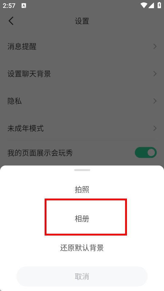 4、在弹出的选项中点击相册,从相册选择喜欢的图片来设置为聊天背景。
