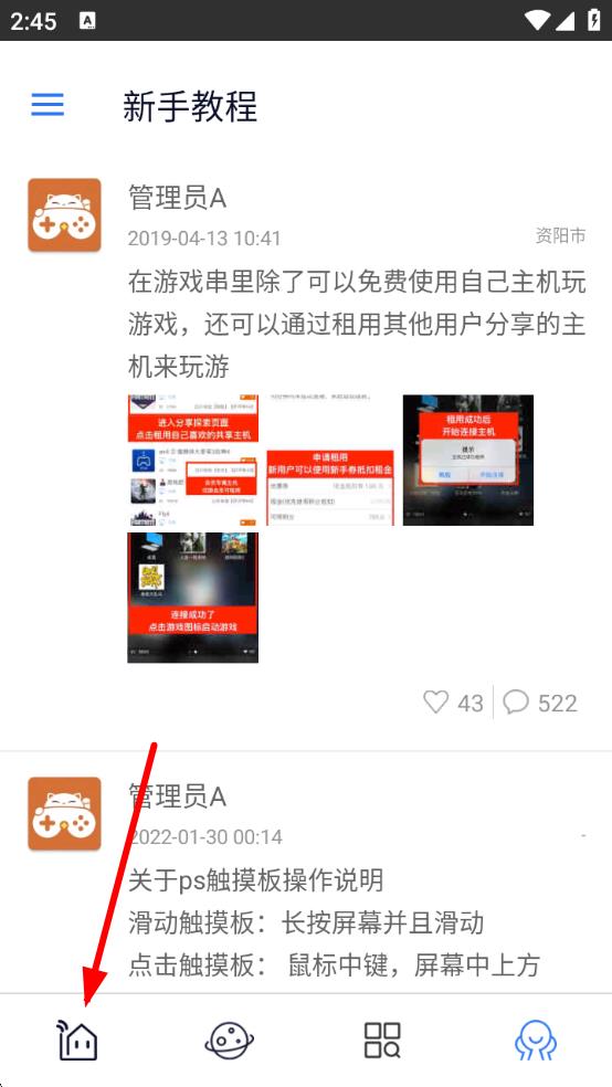 1、打开游戏串应用,在新手教程页面,点击底部导航栏中的主页图标,进入游戏串主页。