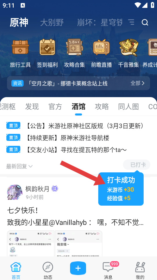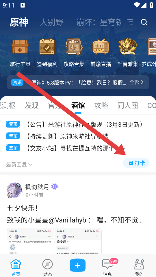 1、打开米游社APP,进入原神频道,切换至酒馆标签页,点击页面右侧的打卡按钮。