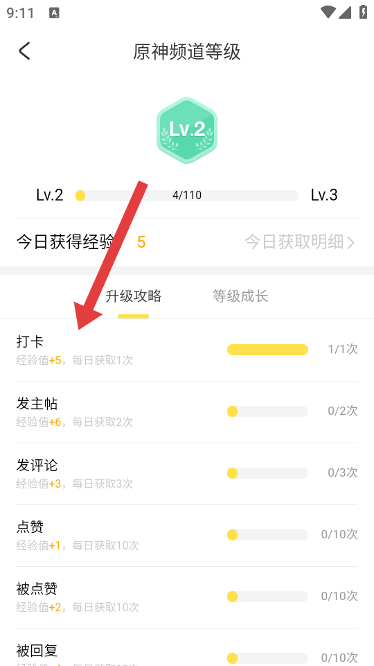 3、点击已打卡可以查看频道等级,在升级攻略栏中,可以查看当日打卡获取的经验,打卡项显示1/1次及经验值。