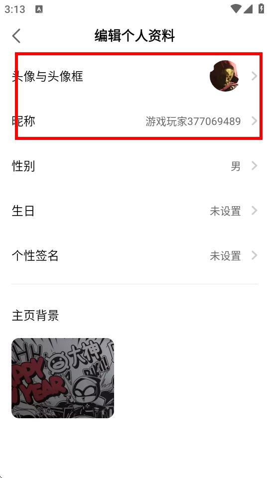 4、在编辑个人资料页面,点击头像与头像框选项可修改头像,点击昵称选项,在弹出界面中输入新名字,确认后即可完成头像和名字的修改。