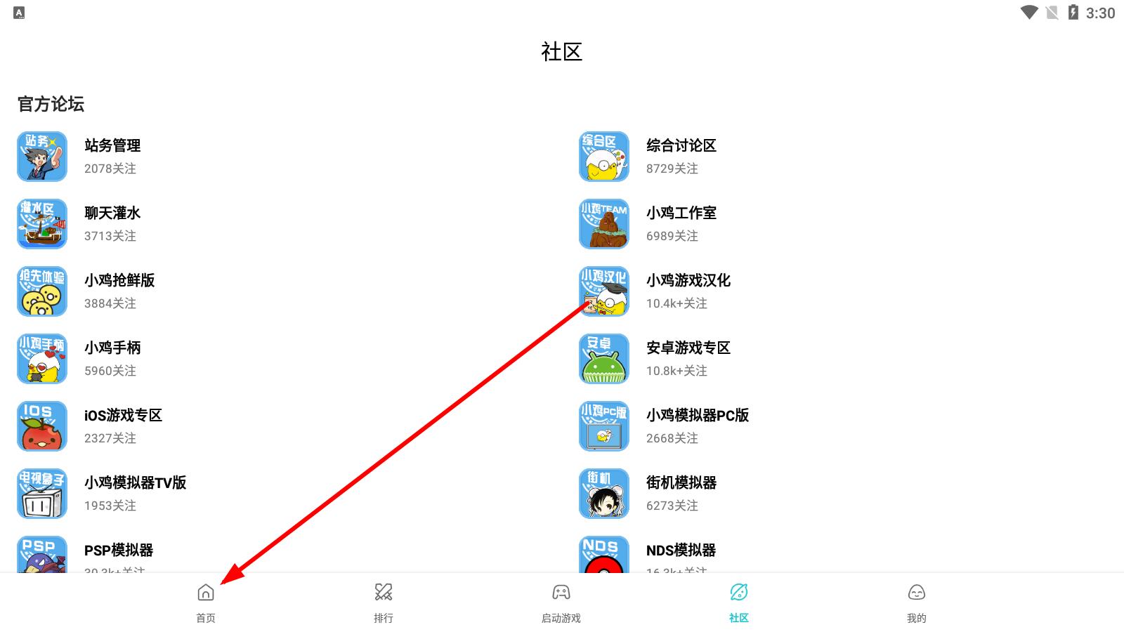 1、打开小鸡模拟器,点击底部导航栏中的首页选项进入首页界面。