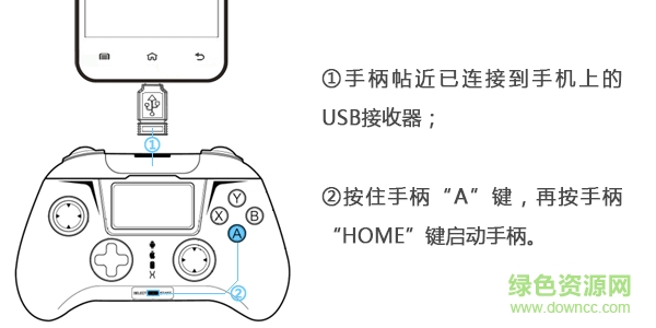 B、手机和USB无线接收器连接之后,将手柄帖近接收器(尽量减少其他信号干扰)按住手柄的“A”键,再按手柄的“HOME”键启动手柄进行连接(与蓝牙的连接启动方式一致)。