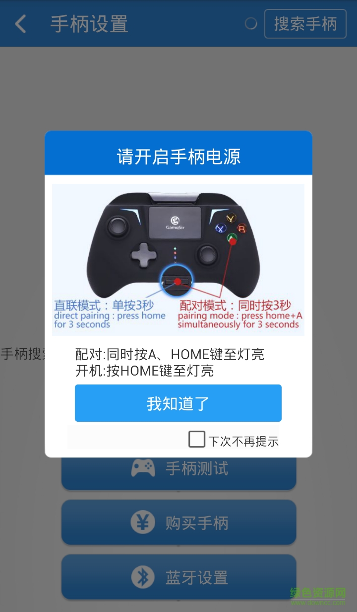 2、界面切换后,会有醒目的提示:“请开启手柄电源”。此时按住手柄“A”键,再按手柄“HOME”键启动手柄,手柄指示灯图标