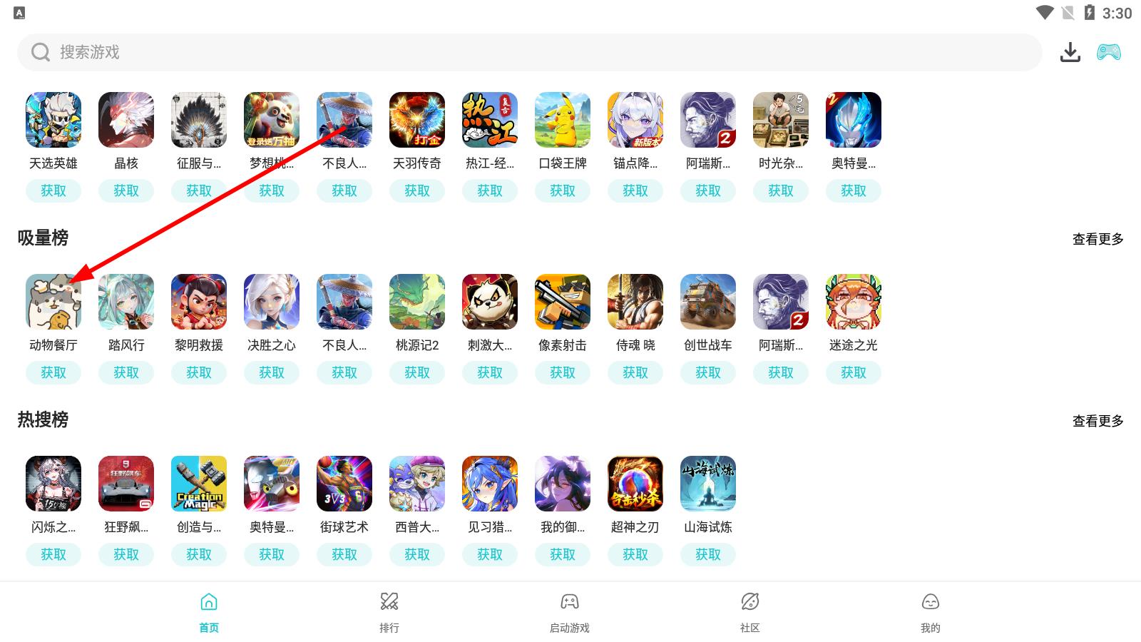 2、在首页的吸量榜等区域,找到想要下载的游戏,比如动物餐厅。