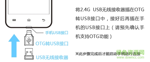 A、将2.4GUSB无线接收器和OTG转USB接口连接上,然后将OTG转换接口的另一端和手机的USB接口连接(可根据自己设备的USB接口大小的情况选择是否使用OTG转换接口,前提是设备必须支持OTG功能);