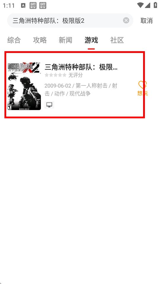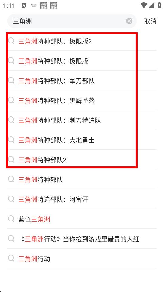 3、在搜索栏中输入你想找的游戏名称,比如三角洲特种部队,下方会弹出相关游戏的搜索联想结果。