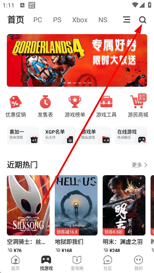 2、在找游戏页面的右上角,点击放大镜搜索图标。