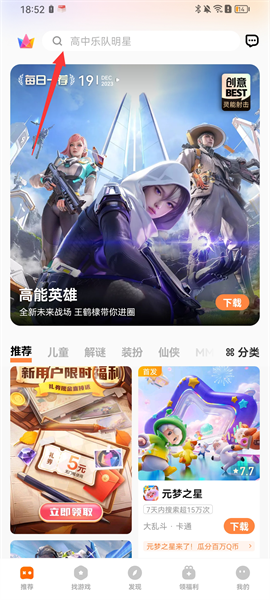 2、来到软件首页,有给大家提供超多的游戏资源,用户也可以直接点击上方的搜索栏,如下图所示,输入游戏名称,快速搜索;