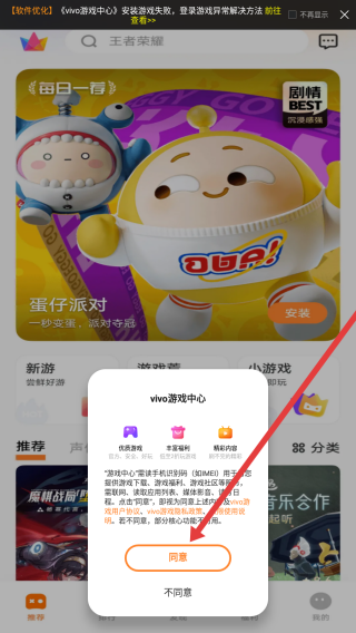 1、打开vivo游戏中心,弹出用户协议及隐私政策提示弹窗,点击橙色同意按钮,进入应用开始浏览游戏。