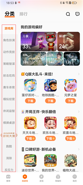 3、点击下方找游戏,可以看见详细的游戏分类,没有目标游戏的玩家可以在这里根据自己喜欢的游戏类型选择玩的游戏,系统还会根据大家的游戏偏好去智能推荐大家可能感兴趣的游戏;