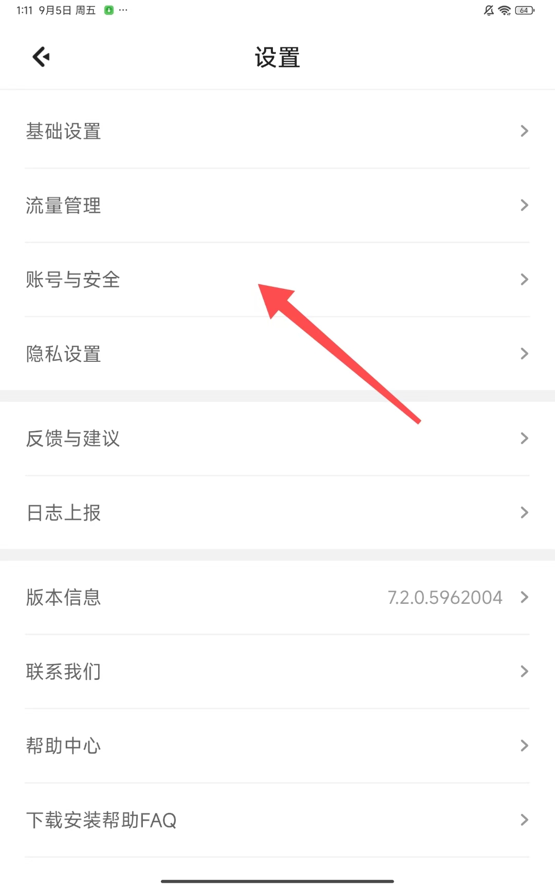 3、进入设置界面后,点击账号与安全选项。