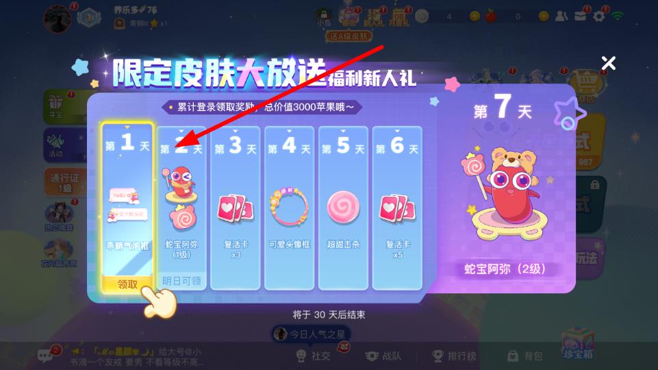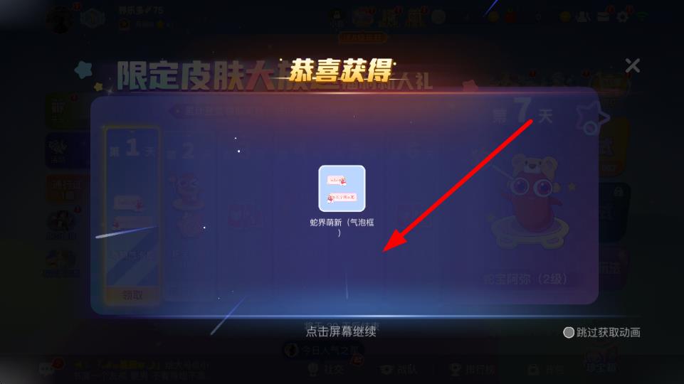 2、在打开的限定皮肤大放送 福利新人礼界面中,能看到累计登录领取奖励的天数栏 ,即可领取对应礼包,像乖萌气泡框等奖励。