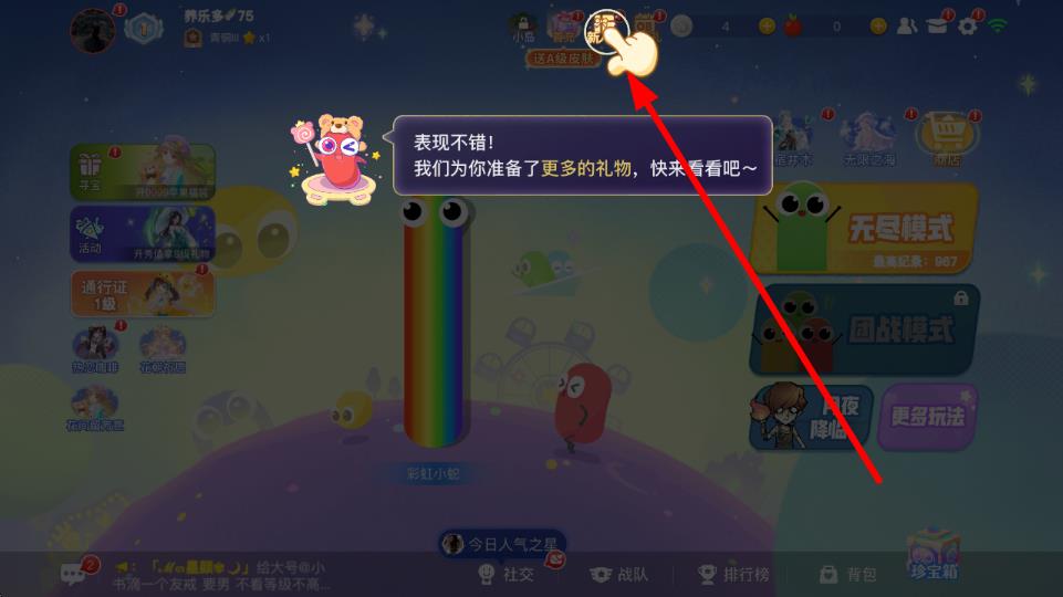 1、进入贪吃蛇大作战游戏主界面,留意界面上方出现的提示信息,点击提示中手指所指的位置,进入礼包领取界面。