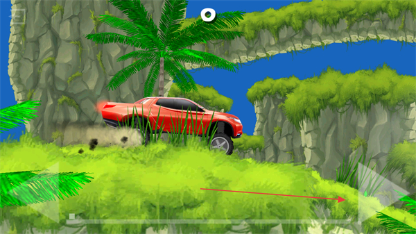1、操控红色越野车在丛林山路中行驶,点击右侧按钮加速前进,穿越草丛和岩石路段。