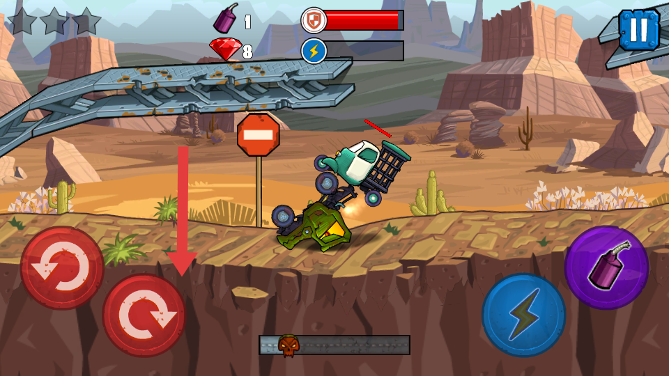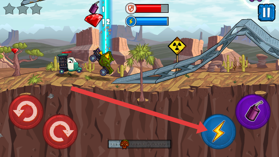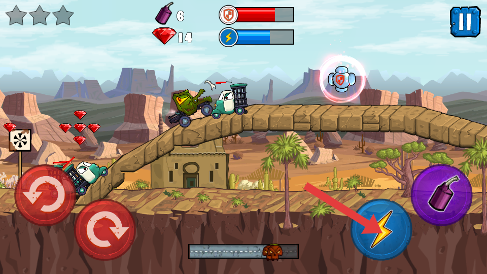 1、核心操作与闯关流程:进入关卡后,左手控制赛车旋转调整重心适应上下坡,右手点击加速键提升车速,遇敌人时释放炸弹摧毁目标,躲避障碍并吞噬车辆。