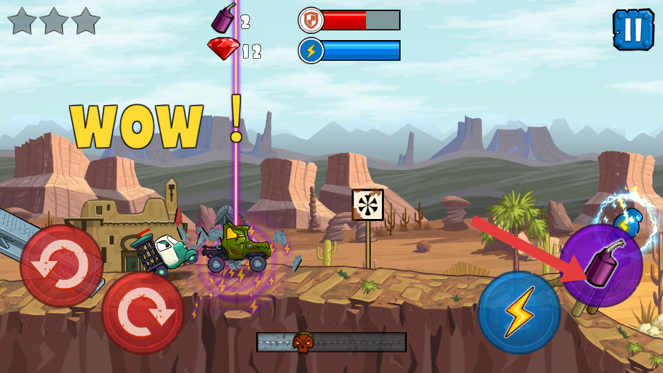 4、在战斗关键时刻,点击箭头指向的紫色炸弹按钮,释放炸弹攻击,对敌方车辆造成大范围且高额的伤害,是击败敌方的强力手段。