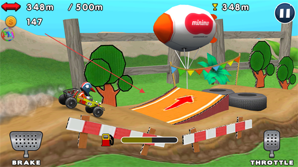 2、借助赛道坡道冲刺,提升行驶距离,向500m关卡目标推进。