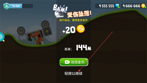 4、若受伤坠落,点击轻按以继续重新开始,可选择双倍金币获取更多奖励。