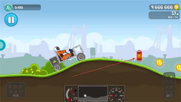 3、继续前进,收集红色电池道具,补充资源,保持赛车行进节奏。