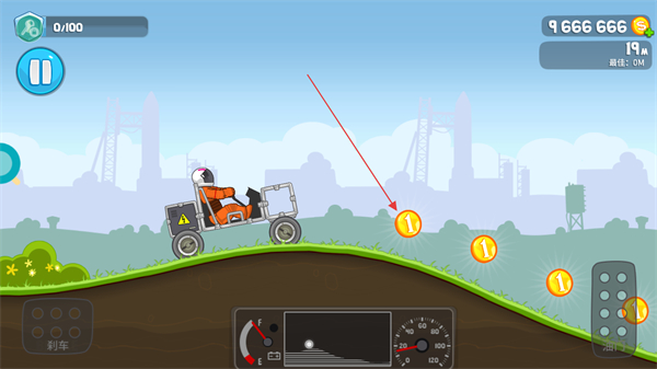 2、沿赛道行驶,收集沿途的金币道具,提升金币数量,推进行驶距离。