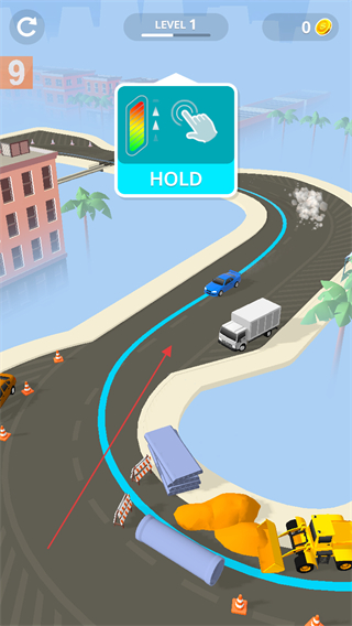 1、按住屏幕蓄力,控制赛车在弯道行驶,注意避开其他车辆和障碍物。
