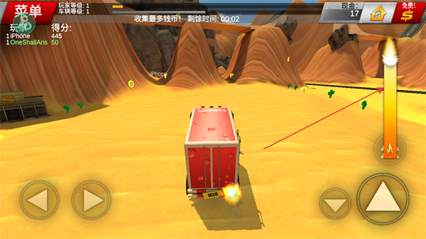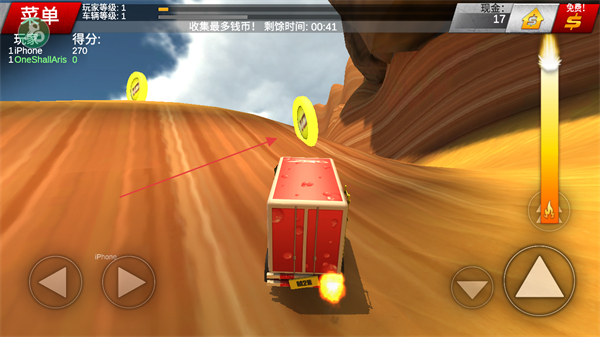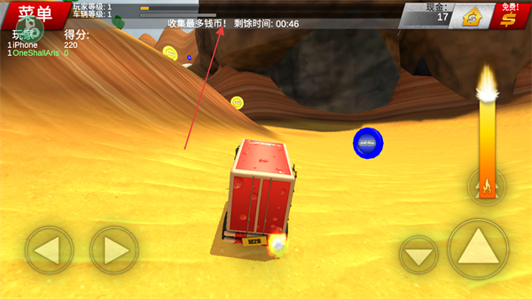 4、在规定时间内,驾驶车辆在沙漠中快速移动,收集更多钱币,完成任务目标。