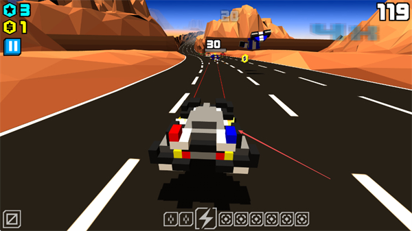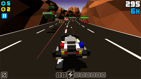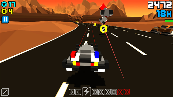 1、操控像素警车在公路上行驶,躲避其他车辆,收集金币和道具,积累分数。