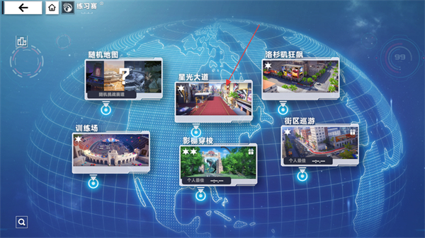 2、这是练习赛的地图选择界面点击星光大道等地图选项即可选定对应赛道进入该赛道的赛车比赛环节。