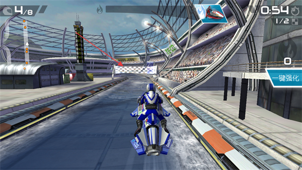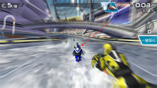 4、比赛过程中需要往方格旗标识的终点推进,当前排名4/8,保持赛艇行驶路线以提升排名,获取更优赛事奖励。