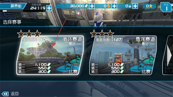 2、进入赛事选择界面后,可挑选循环赛道等赛事,不同赛道对应不同难度指数与奖励,点击赛道旁的比赛按钮即可开启对应赛事。