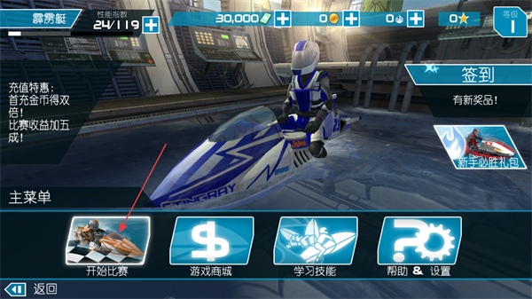 1、在主界面选择当前载具霹雳艇,点击开始比赛进入赛事选择环节,同时可通过其他按钮进入游戏商城、学习技能等功能模块。