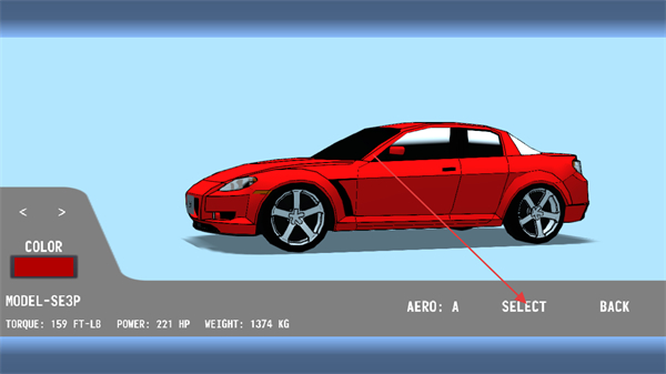 1、在选车界面选择红色SE3P车型,点击SELECT进入比赛。