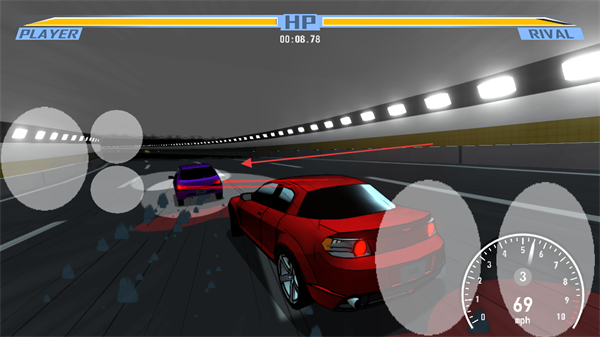 2、操控红色车辆,在隧道中追击紫色对手车,通过按键调整方向。