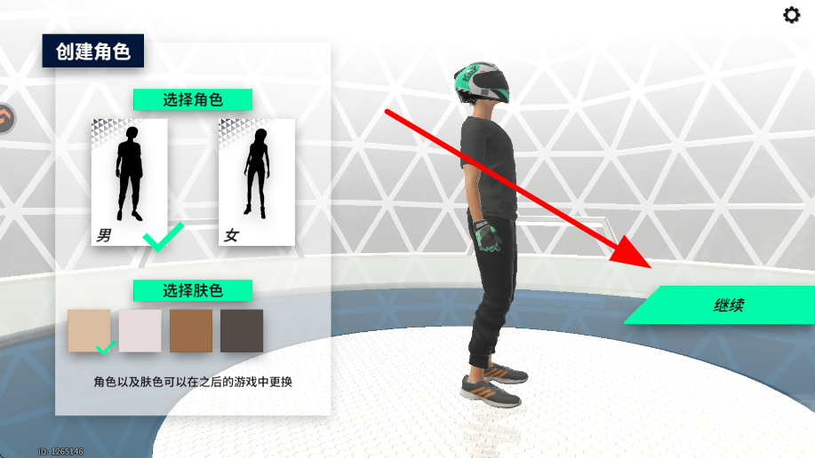 1、首先进入游戏,在创建角色界面,选择角色性别,挑选合适的肤色,设置完成后点击继续,开启在黎明飞驰的竞速之旅。