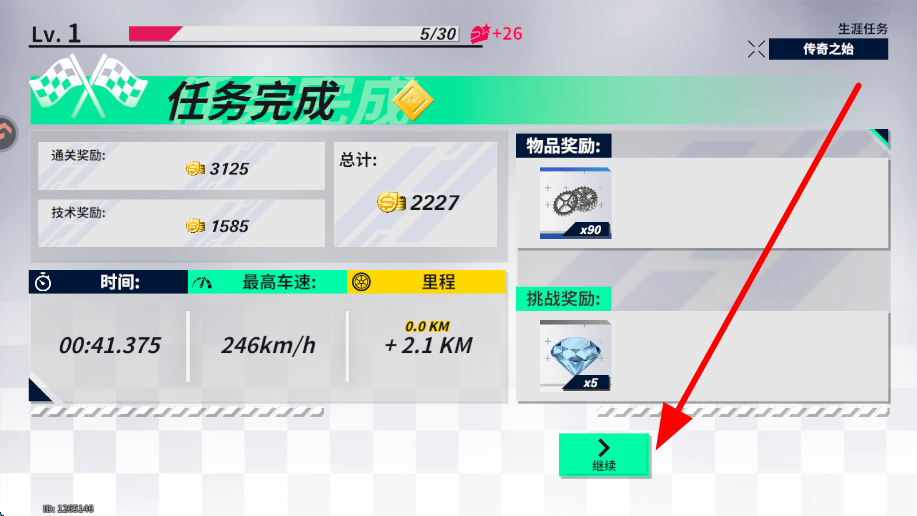 4、最后成功完成任务后,会显示任务完成界面,可获取通关奖励、技术奖励等各类奖励,之后点击继续,参与更多竞速任务。