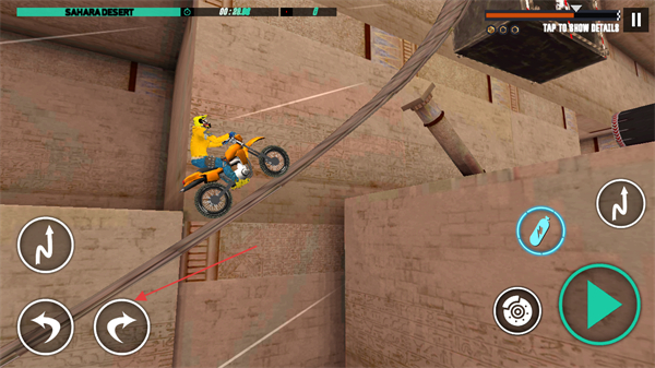 1、驾驶摩托车在沙漠场景的复杂赛道行驶,利用左右转向和加速按钮,在卡车、建筑间穿梭,挑战高难度地形。