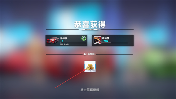 4、在比赛结算奖励界面显示恭喜获得的道具,按提示点击屏幕继续完成结算。