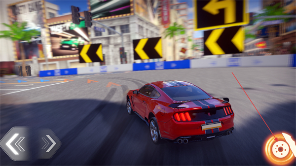 2、赛车比赛操控界面左侧方向键控制转向,右侧刹车键可控制车辆减速,同时按下两个按钮可以进行漂移过弯的操作。