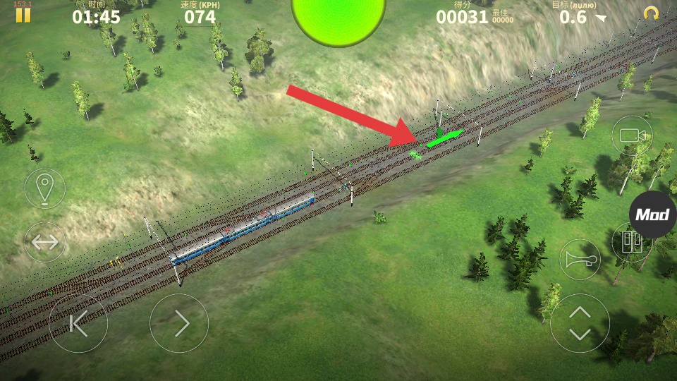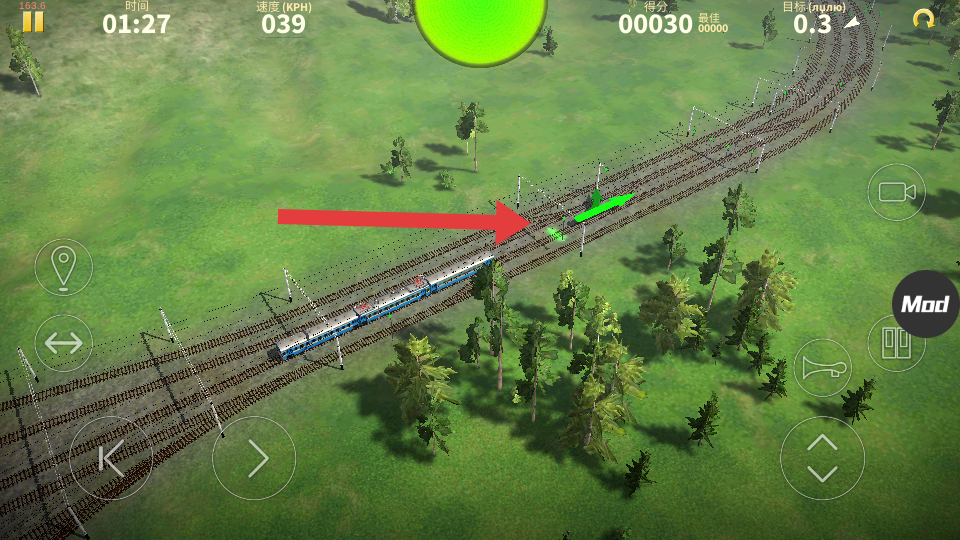 4、当列车行驶到合适位置时,朝着箭头指向的绿色的目标的区域开始行驶,确保列车沿着正确轨道前进,朝着目标不断推进。
