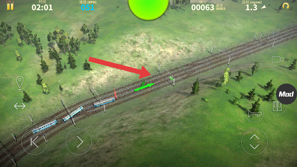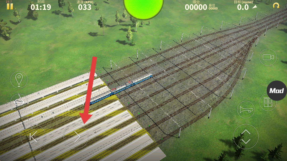 1、在列车行驶过程中,点击箭头指向的向右操作按钮,可控制列车向右变道,适应复杂的铁路线路布局,确保列车按规划路线行驶。
