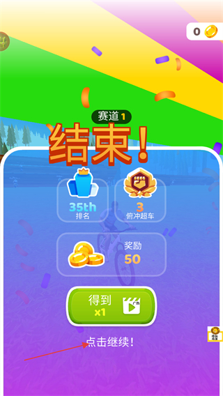 4、到达终点后,查看排名、超车数量和奖励,点击点击继续进入下一场景。