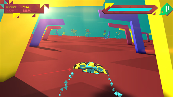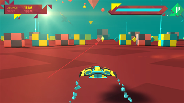 1、操控几何飞船在彩色场景中飞行,躲避紫色、彩色方块等障碍物,不断推进距离如从51M到151M。