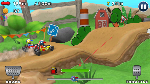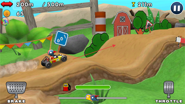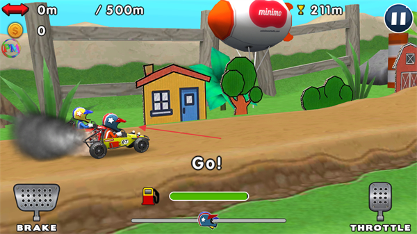3、操控赛车收集金币,保持动力向500m目标推进,避开赛道障碍。